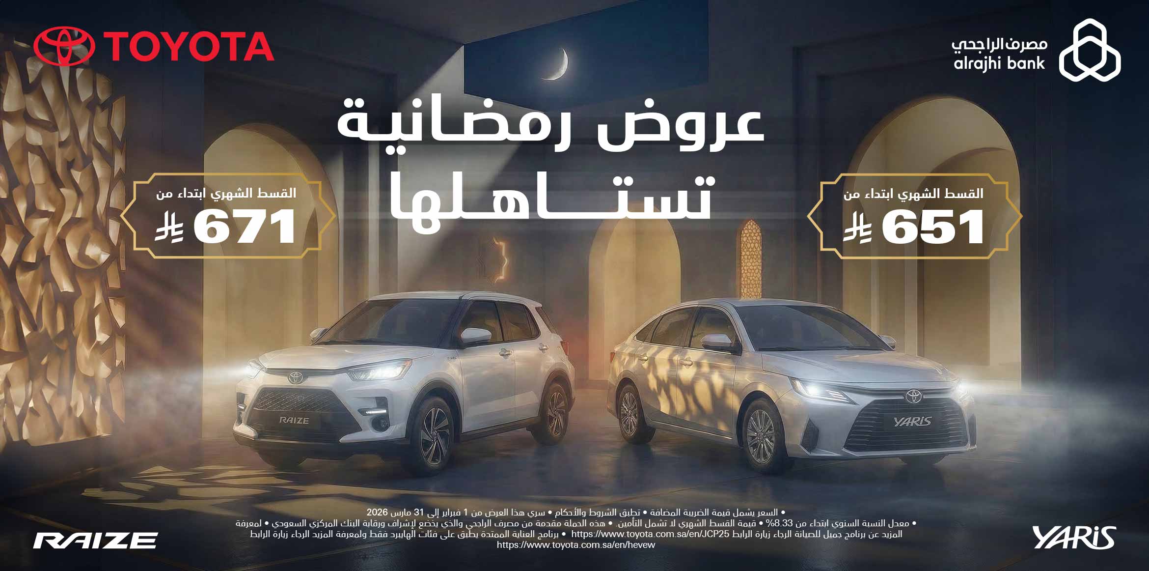 | 733 ريال سعودي | 8.60% | 5 سنوات | 1% | 50% | 0% | 2026 | Yaris |