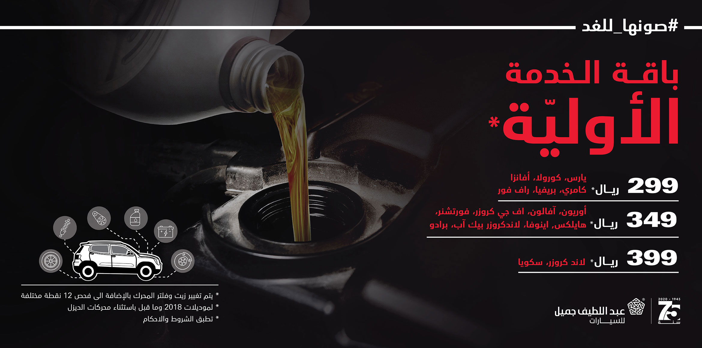 تشمل أسعار الباقات تغير زيت وفلتر المحرك وباستخدام زيوت تويوتا الاصلية وقطع غيار اصلية (زيت تويوتا API GRADE SM 10W-30، يتم تغييره كل 10,000 كم)، بالإضافة الى فحص وضبط 12 نقاط في السيارة.