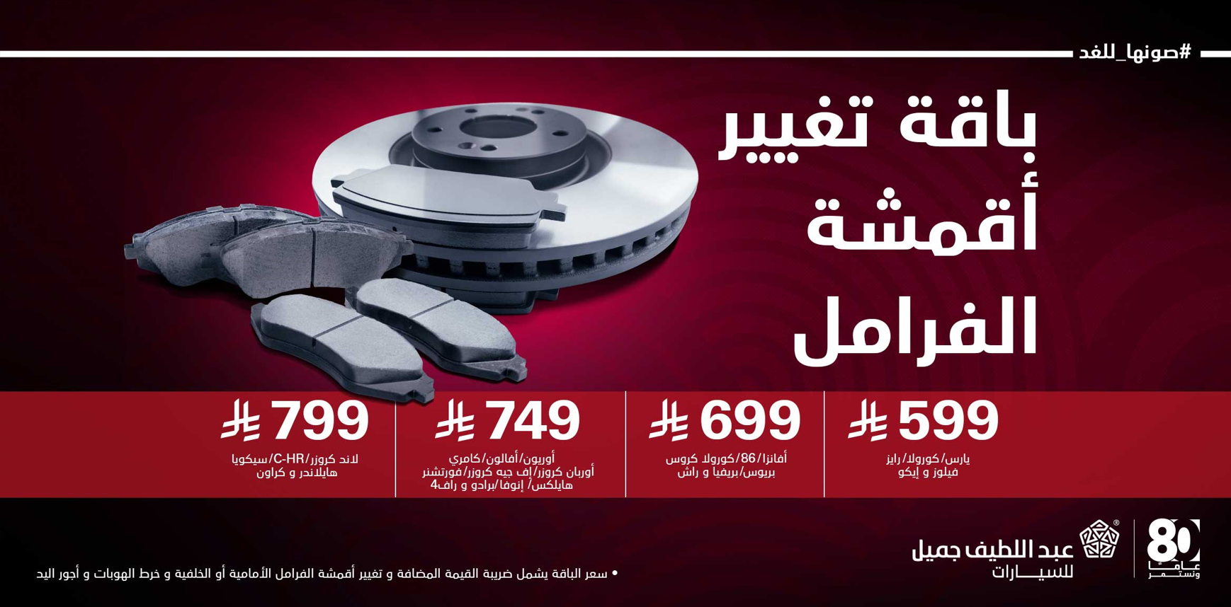 تسري شركة عبداللطيف جميل حملة لتغيير الفرامل والتي تشمل على تغيير الفرامل الأمامية أو الخلفية، خرط الهوبات مع أجور اليد و شاملا الضريبة ايضا