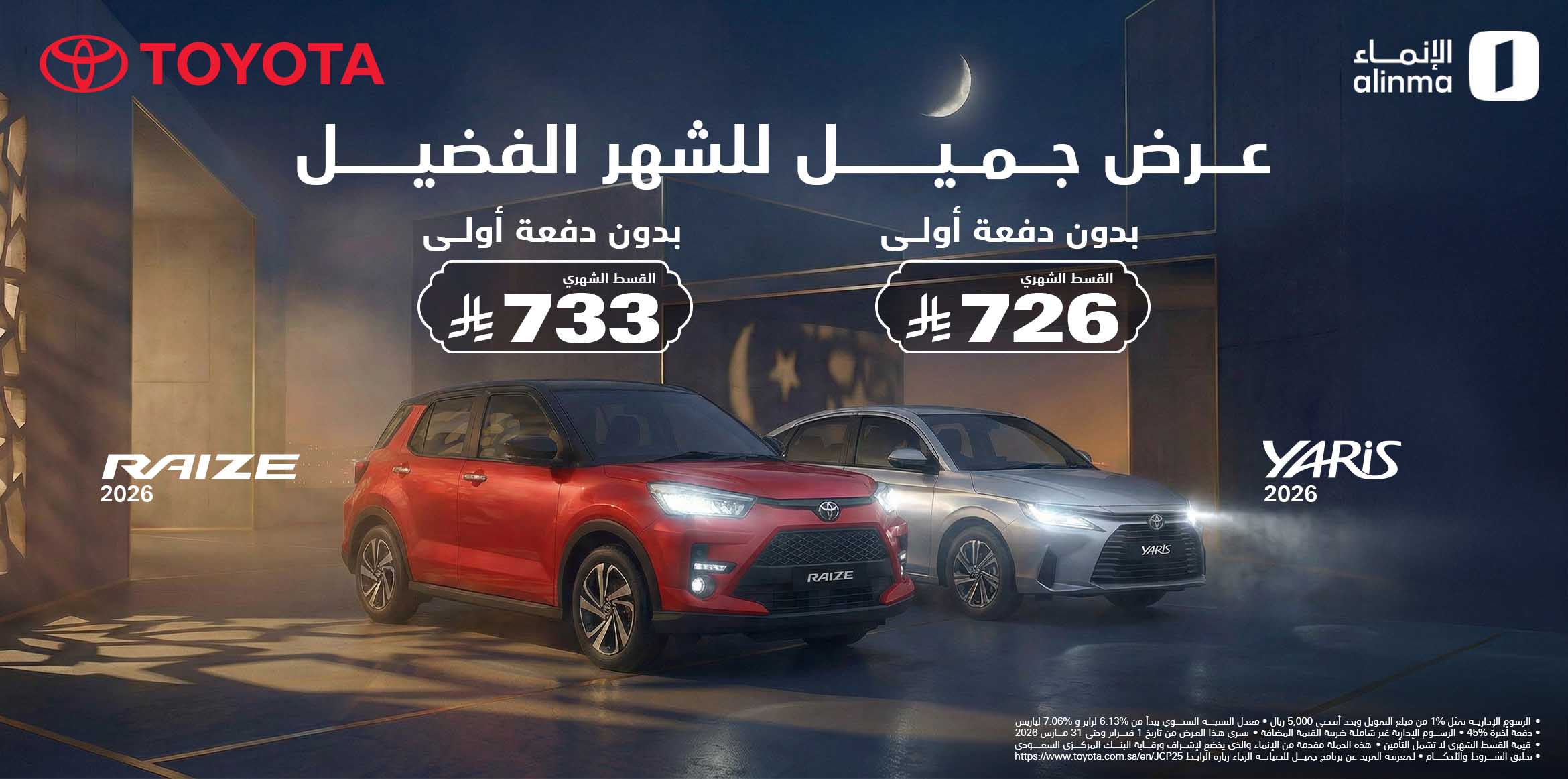 تعرّف على عروضنا المميزة لسيارات تويوتا بالشراكة مع إنماء.