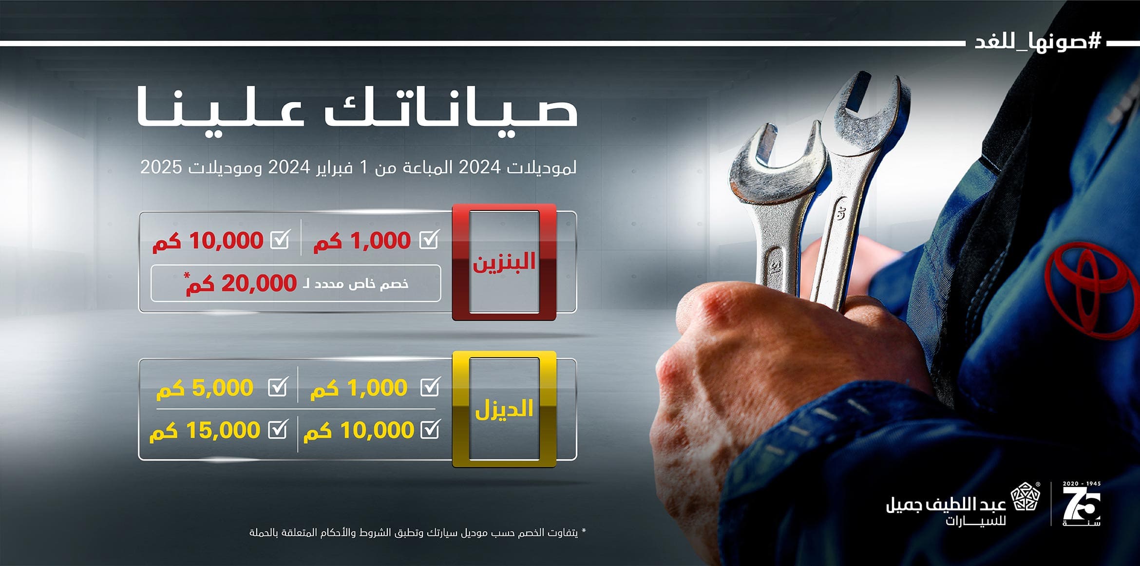 ينطبق هذا البرنامج على سيارات تويوتا الجديدة موديل 2024 & 2025 المشمولة والمستوردة عن طريق الموزع المعتمد لشركة تويوتا بالمملكة العربية السعودية (عبد اللطيف جميل للسيارات) والمباعة ابتداء من 1 فبراير 2024 فقط.
