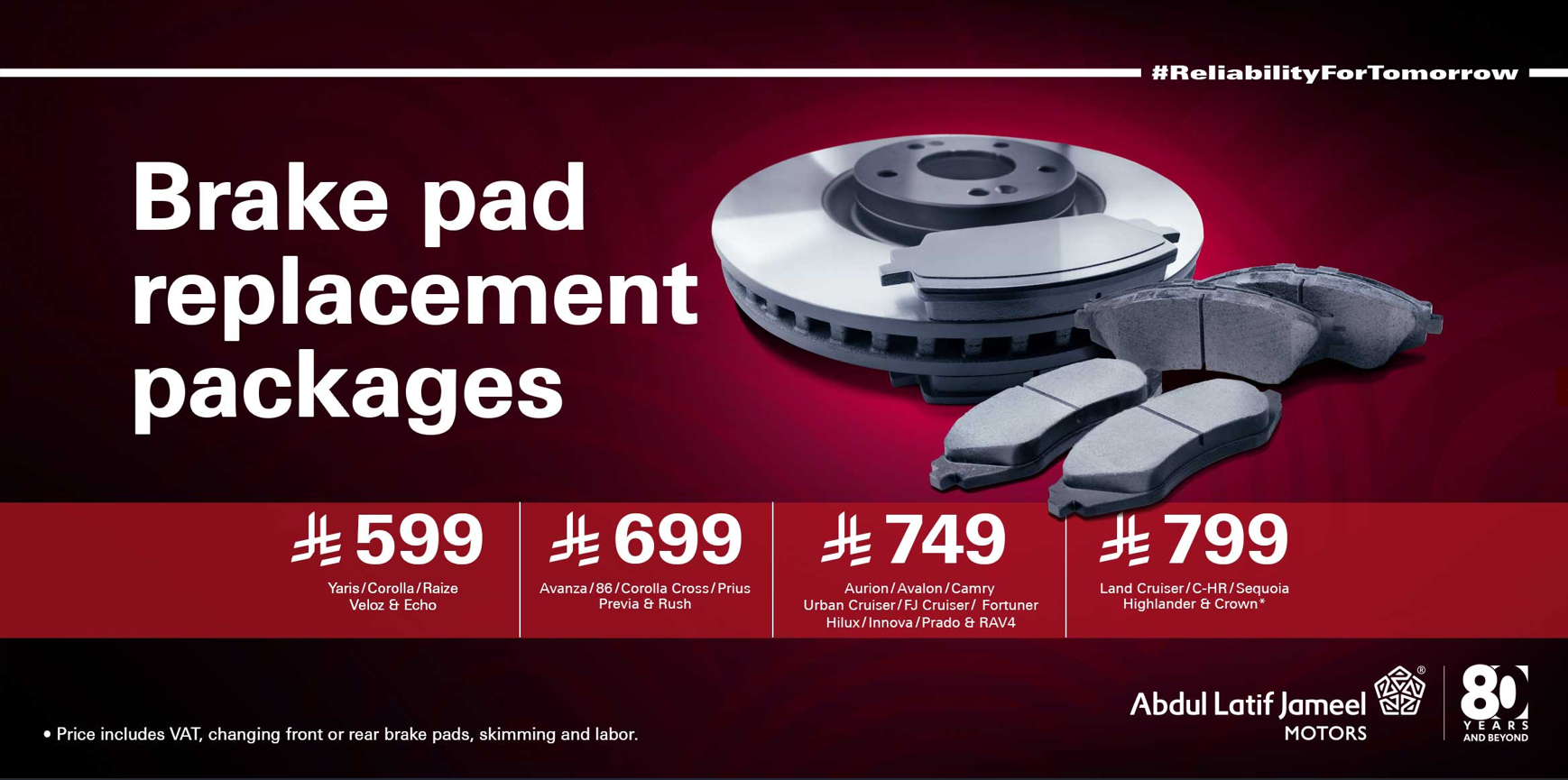 ALJ is running a tactical brake pads change campaign which includes changing rear or front brake pads, skimming, labor and VAT.