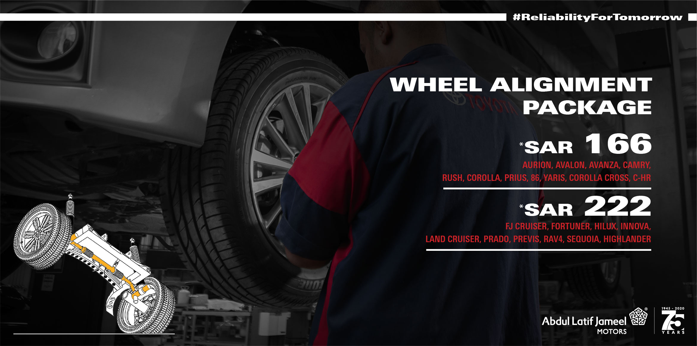 - Prices of Wheel Alignment package for passengers cars (Aurion, Avalon, Avanza, Camry, Corolla, Prius, Rush, Toyota 86, Yaris, Corolla Cross, C-HR) price = SA 166