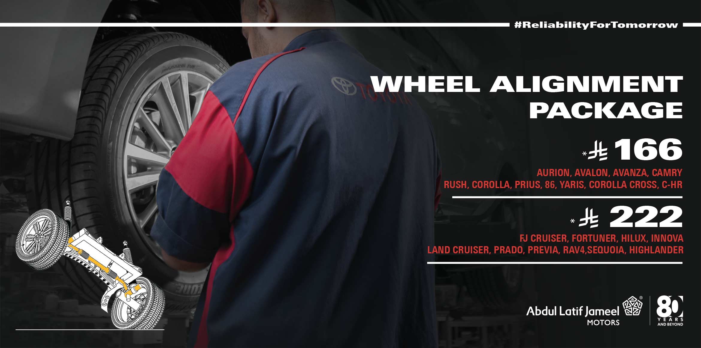 • Prices of Wheel Alignment package for passengers cars (Aurion, Avalon, Avanza, Camry, Corolla, Prius, Rush, Toyota 86, Yaris, Corolla Cross, C-HR) price = SA 166
