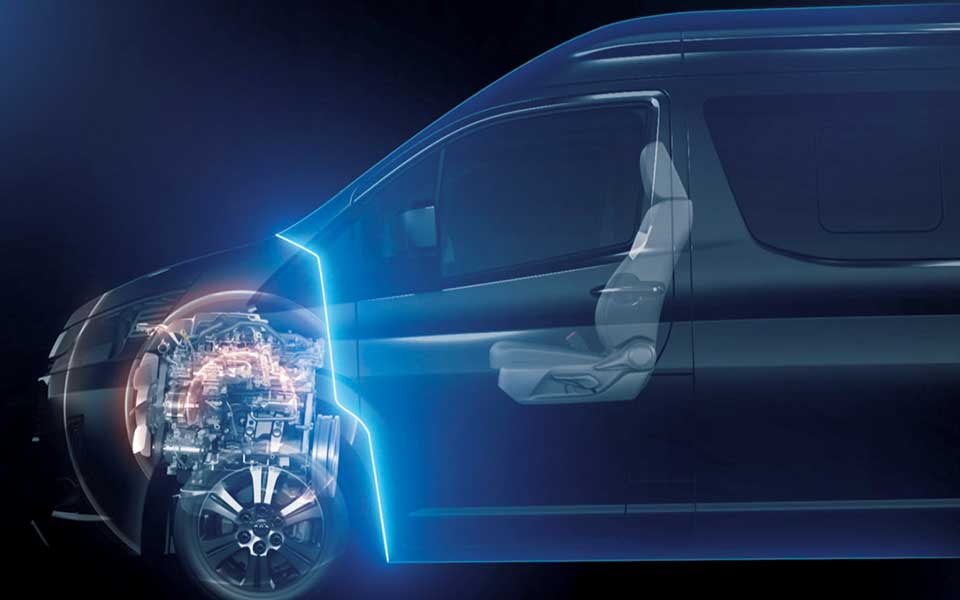 With the semi-bonneted front-end design, the engine, which until now has been located beneath the front seats, is shifted forward. This helps create a cabin space with enhanced quietness and comfort.
