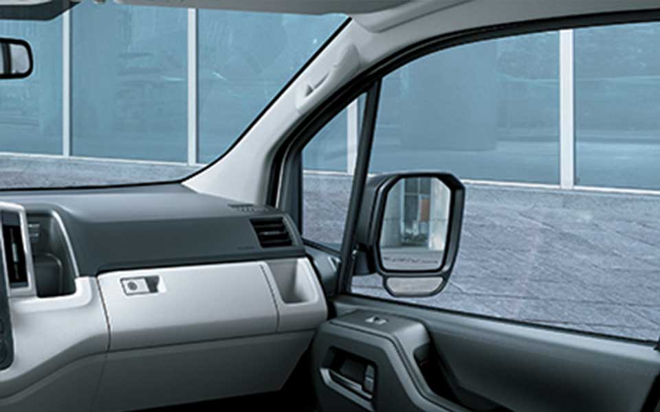 The anterior of the front side window has been lowered and a large quarter glass installed to help ensure excellent forward visibility. An auxiliary mirror has been added, enabling checking in the downward field of view.