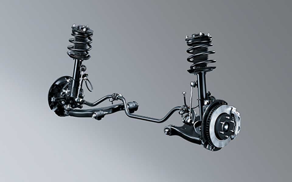 A MacPherson strut suspension is adopted for the front and a leaf spring suspension for the rear, helping assure ample suspension stroke. The suspension helps achieve excellent straight-line stability as well as a quiet and comfortable ride. The adoption of disc brakes for the front and rear yields excellent braking force.