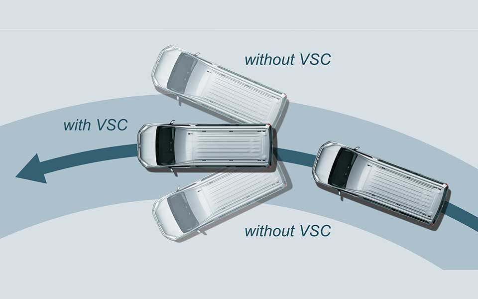 VSC uses sensor input to detect skidding of the vehicle on slippery road surfaces, and helps ensure vehicle stability by selectively applying the brakes to individual wheels while controlling engine power output.