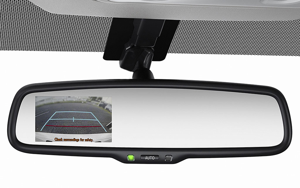 In digital mirror mode, images captured by the rear camera are displayed in the rearview mirror. This allows the driver to check the rearward view without obstruction by rear-seat headrests and passengers.