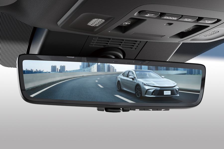 A video of what is behind the car is shown on a display inside the rearview mirror.