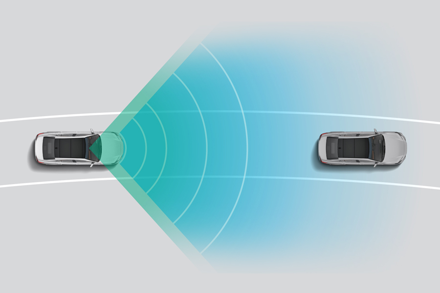 Millimeter-wave radar and a monocular camera are used to detect the vehicle in front, allowing the car to follow them while maintaining a distance that is based on vehicle speed.
